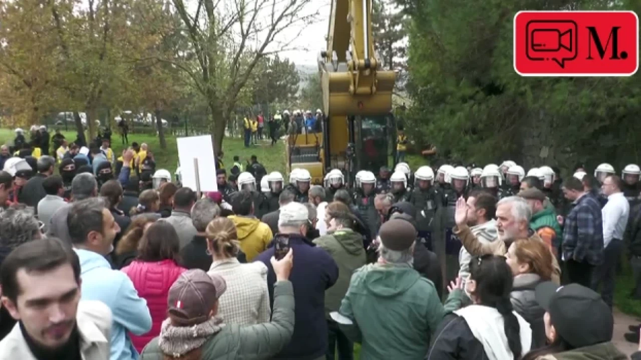 Bölge halkı megafonlarından, "Polis bizi koru, yeşili koru; iş makinesini koruma" sloganları atıyor.