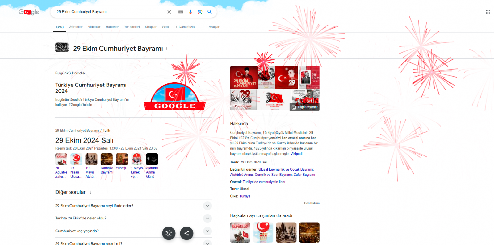 Doodle'a tıklandığında ise Google,''29 Ekim Cumhuriyet Bayramı'' aramasına götürüyor ve ekranda havai fişekler patlıyor.