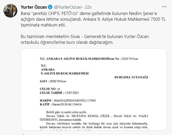 Yurter Özcan'ın 2021 Temmuz ayında konuya ilişkin attığı tweet: