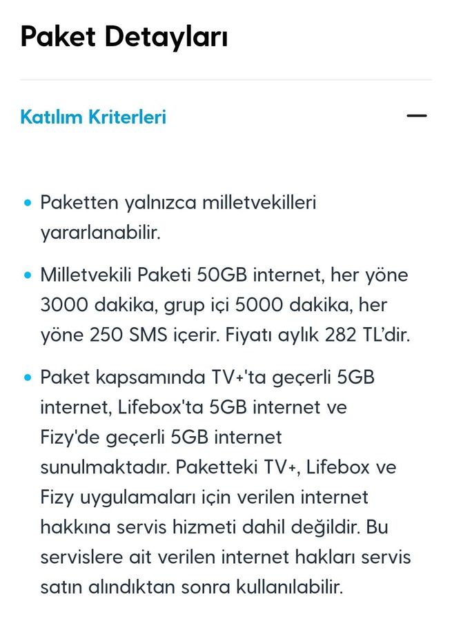 Paket detaylarında paketten yalnızca milletvekillerinin faydalanabileceği belirtilirken, paket kapsamında TV+, Lifebox ve Fizy uygulamalarında geçerli 5'er GB internet verildiği ifade edildi.
