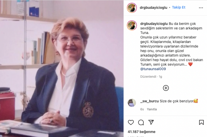 Buğdaycıoğlu paylaşımında, "Bu da benim çok sevdiğim sekreterim ve can arkadaşım Tuna. Onunla çok uzun yıllarımız beraber geçti. Kitaplarımda, kitaplardan televizyonlara uyarlanan dizilerimde hep onu, onunla olan güzel arkadaşlığımızı anlattım sizlere. Gözleri hep hayat dolu, cıvıl cıvıl bakan Tunam, seni çok seviyorum..." ifadelerini kullandı.