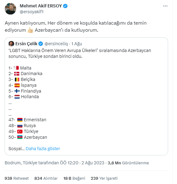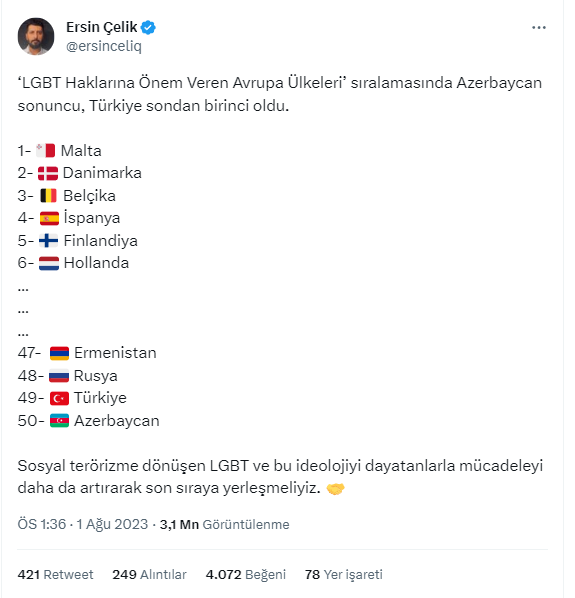 Yeni Şafak Gazetesi’nden Ersin Çelik sosyal medya hesabından ‘LGBT Haklarına Önem Veren Avrupa Ülkeleri’ sıralamasına ilişkin detaylar paylaştı. Azerbaycan’ın sonuncu, Türkiye’nin ise sondan ikinci olduğunu vurguladı.