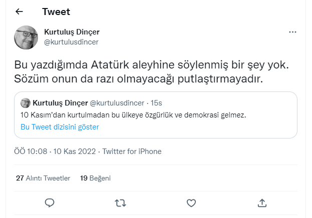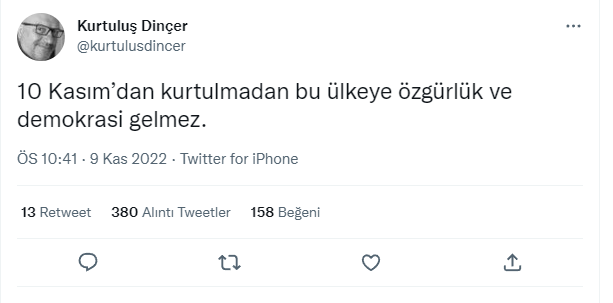 Dinçer ilk tweetinde, "10 Kasım’dan kurtulmadan bu ülkeye özgürlük ve demokrasi gelmez." dedi.