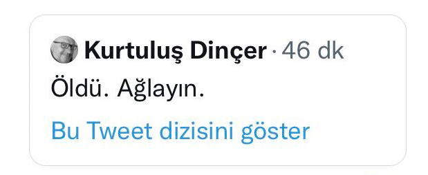 Devamında paylaştığı bir tweette, "Öldü ağlayın" sözlerini kullandı.