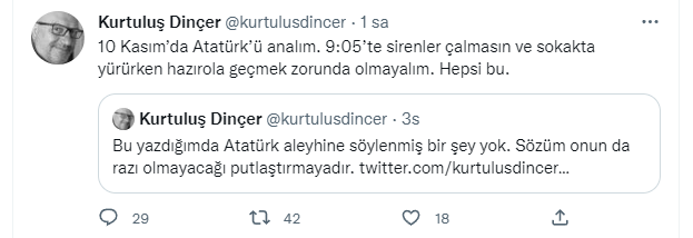 Son paylaşımı da tartışılacak cinstendi: "10 Kasım’da Atatürk’ü analım. 9:05’te sirenler çalmasın ve sokakta yürürken hazırola geçmek zorunda olmayalım. Hepsi bu."