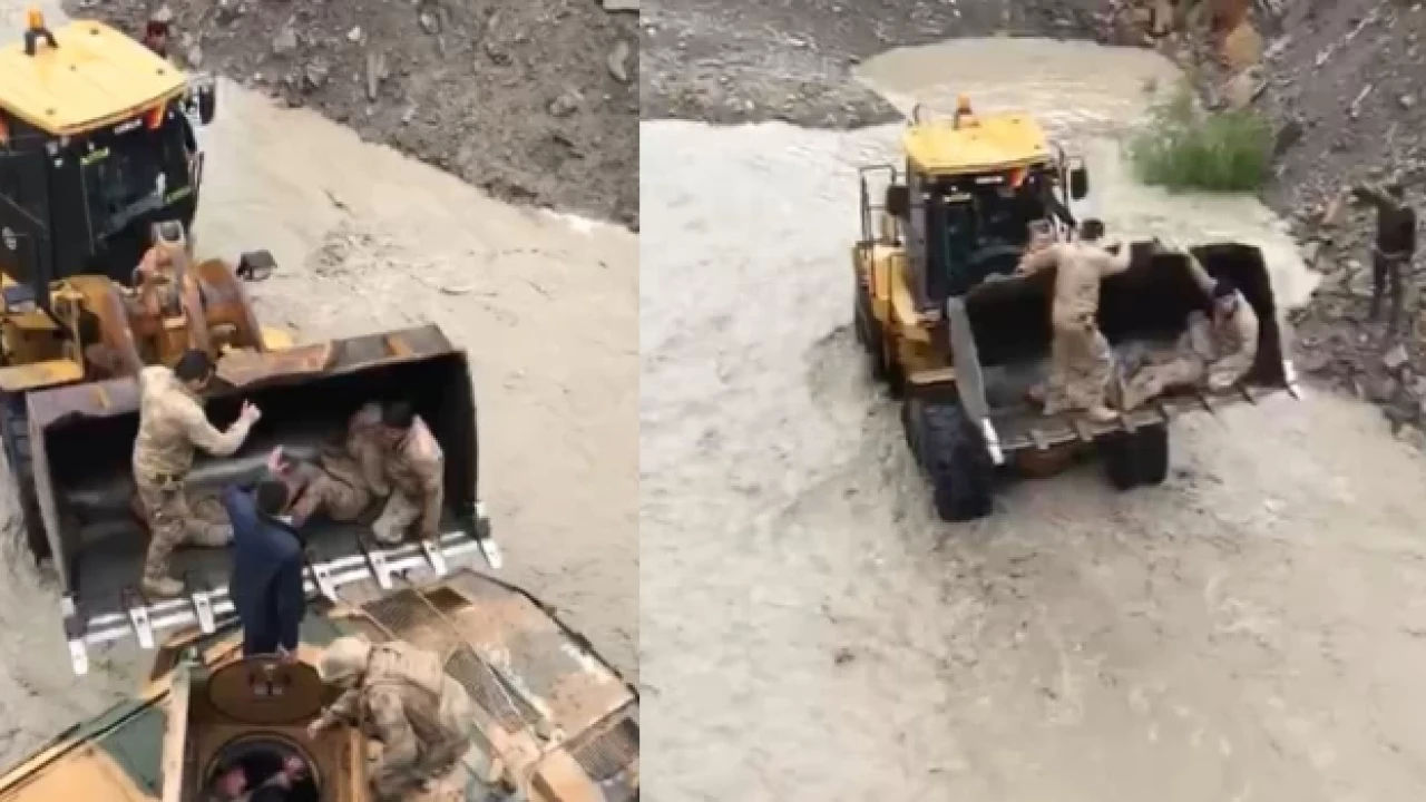 Orada bulunan jandarma ekipleri ve köylülerin yardımı ile zırhlı araçta olan askerler iş makinesinin kepçesiyle tek tek araçtan çıkartıldı.