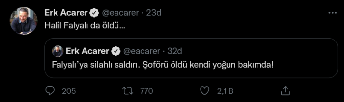 Gazeteci Erk Acarer, silahlı saldırıya uğrayan Halil Falyalı'nın öldüğünü sosyal medya hesabından açıkladı.