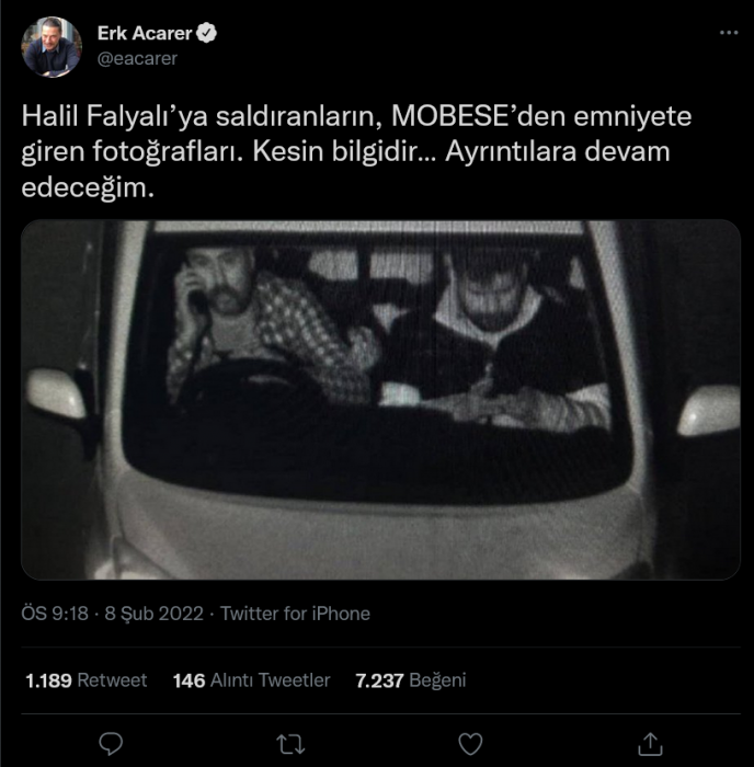 Acarer paylaşımına, "Halil Falyalı’ya saldıranların, MOBESE’den emniyete giren fotoğrafları. Kesin bilgidir… Ayrıntılara devam edeceğim" notunu düştü.