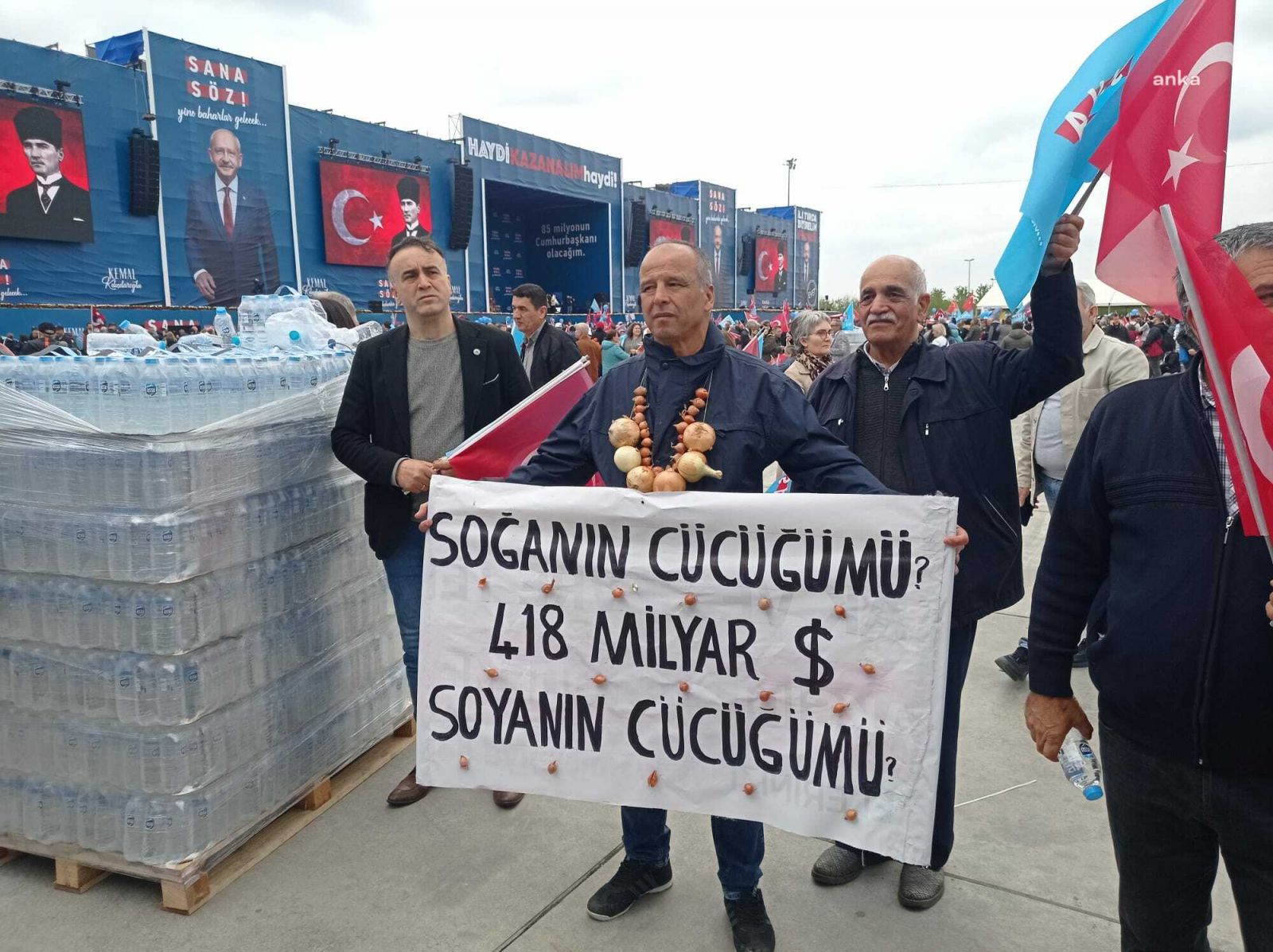 Boynuna soğanları kolye yapan ve elinde “Soğanın cücüğü mü, 418 milyar dolar soyanın cücüğü mü” yazılı pankartla Ümraniye’den mitinge gelen Erol Timurçelik, soğanın bir simge olduğunu söyledi. Yurttaş, “Ülkemizdeki ekonomik sıkıntıyı simgeleyen bir yiyeceğimiz soğan. Maalesef soğan, altın kadar değerli oldu. Bunun gibi birçok yiyecekler sayabiliriz. Tayyip Erdoğan’ı devirecek olan soğan, patates olacak” dedi. Soğanlardan yaptığı kolyeye bir de alyans yüzük takan yurttaş, sözlerini şöyle sürdürdü: