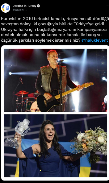 Büyükelçilik sosyal medya hesabındaki paylaşımınında, Haluk Levente, Ukrayna'daki savaş sebebiyle Türkiye'ye gelen Eurovision 2016 birincisi Kırımlı Tatar sanatçı Jamala ile konser yapmak isteyip istemeyeceğini sordu.