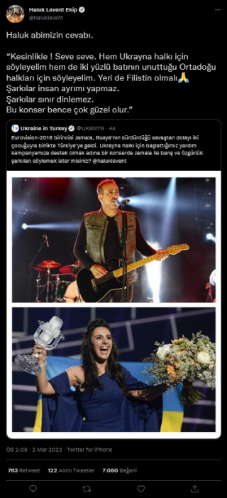 Ukrayna'nın Türkiye Büyükelçiliği Twitter hesabından şarkıcı Haluk Levent'ten Ukrayna halkı için başlatılan yardım kampanyası için şarkıcı Jamala ile birlikte konser vermesi teklifinde bulundu.