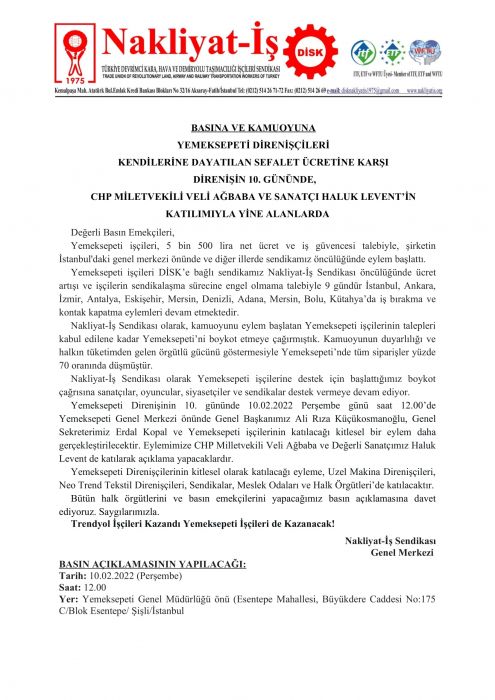 Yarın eylemin 10’uncu gününde Yemeksepeti Genel Merkezi önünde gerçekleştirilecek protestoya, Nakliyat-İş yöneticilerinin yanı sıra CHP Genel Başkan Yardımcısı ve Malatya Milletvekili Veli Ağbaba ile sanatçı Haluk Levent’in de katılacağı kaydedildi.
