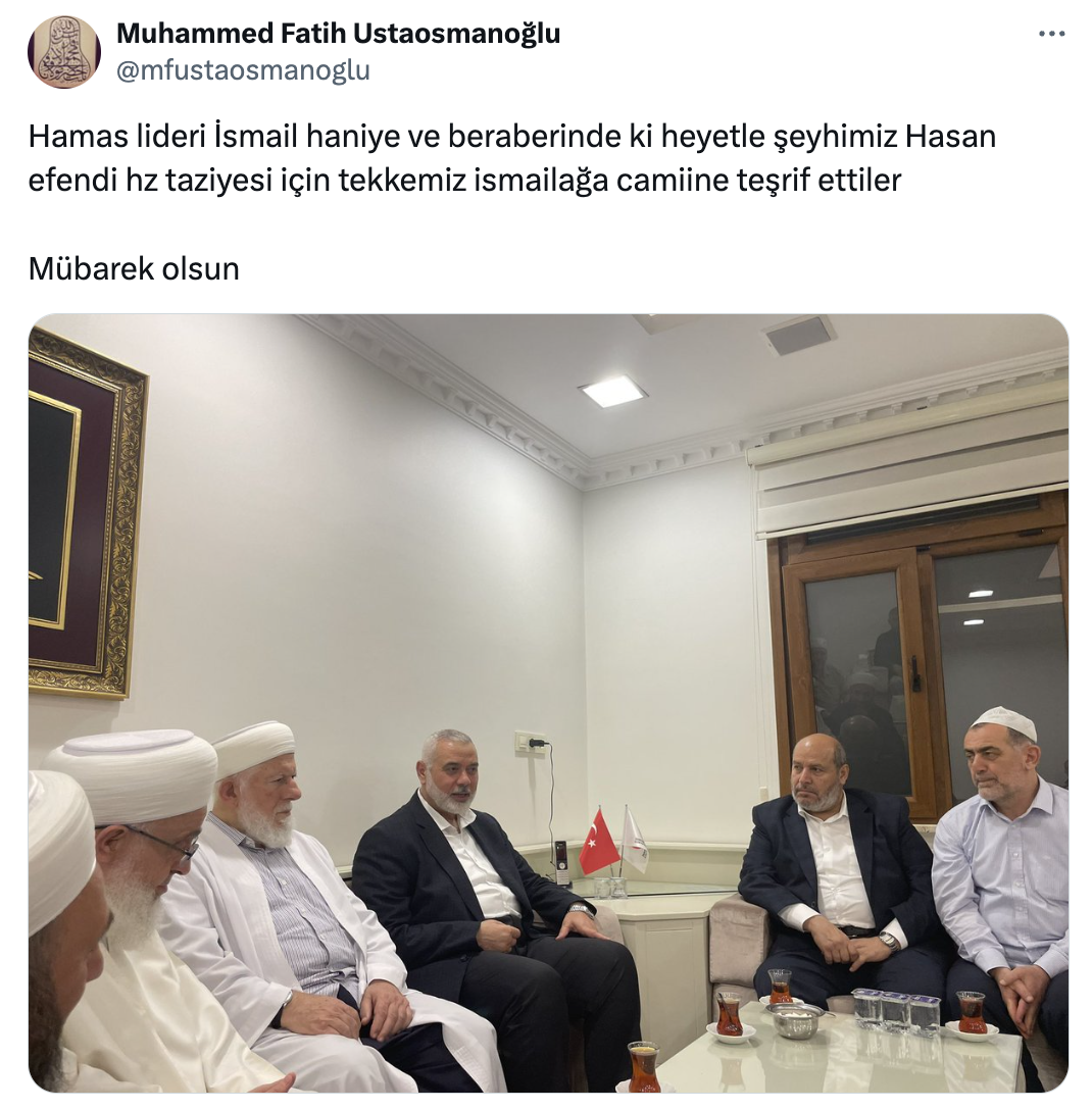İsmailağa cemaatinin bir önceki lideri Mahmut Ustaosmanoğlu'nun torunu Muhammed Fatih Ustaosmanoğlu, Hamas lideri İsmail Haniye'nin İsmailağa ziyaretini X hesabından duyurdu. Ustaosmanoğlu'nun paylaştığı mesajda, "Hamas lideri İsmail Haniye ve beraberindeki heyetle şeyhimiz Hasan Efendi hz taziyesi için tekkemiz İsmailağa Camii'ne teşrif ettiler" diye yazdı ve ziyaretten kareler paylaştı.