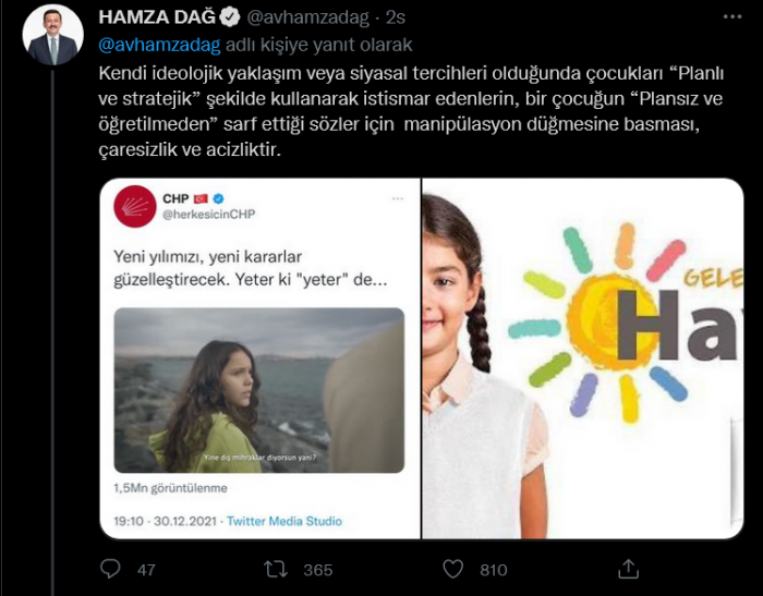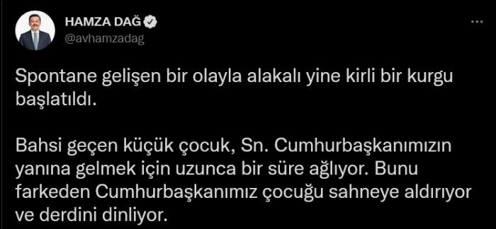 Hamza Dağ, "Spontane gelişen bir olayla alakalı yine kirli bir kurgu başlatıldı. Bahsi geçen küçük çocuk, Sayın Cumhurbaşkanımızın yanına gelmek için uzunca bir süre ağlıyor. Bunu fark eden Cumhurbaşkanımız çocuğu sahneye aldırıyor ve derdini dinliyor. Kendi ideolojik yaklaşım veya siyasal tercihleri olduğunda çocukları 'Planlı ve stratejik' şekilde kullanarak istismar edenlerin, bir çocuğun 'Plansız ve öğretilmeden' sarf ettiği sözler için manipülasyon düğmesine basması, çaresizlik ve acizliktir" ifadelerini kullandı. Dağ'ın açıklamaları şöyle:
