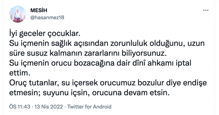 Twitter'dan paylaşım yapan Mezarcı, "İyi geceler çocuklar. Su içmenin sağlık açısından zorunluluk olduğunu, uzun süre susuz kalmanın zararlarını biliyorsunuz. Su içmenin orucu bozacağına dair dînî ahkâmı iptal ettim. Oruç tutanlar, su içersek orucumuz bozulur diye endişe etmesin; suyunu içsin, orucuna devam etsin" yazdı.