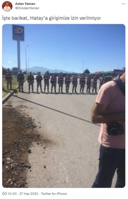 Zafer Partisi Genel Başkan Yardımcısı Aslan Yaman da yolu kapatan jandarma ekiplerinin fotoğrafını sosyal medya hesabından paylaşıp "İşte barikat, Hatay’a girişimize izin verilmiyor" açıklaması yaptı.