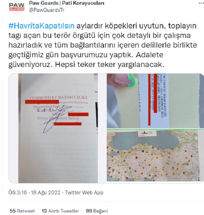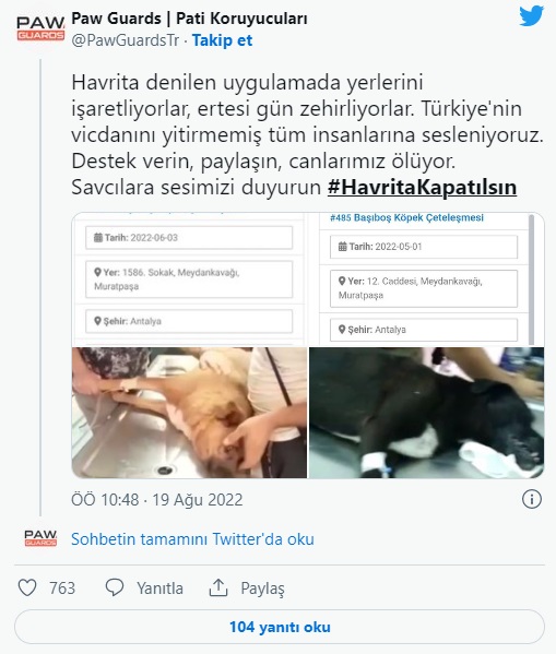 "Havrita denilen uygulamada yerlerini işaretliyorlar, ertesi gün zehirliyorlar. Türkiye'nin vicdanını yitirmemiş tüm insanlarına sesleniyoruz. Destek verin, paylaşın, canlarımız ölüyor. Savcılara sesimizi duyurun #HavritaKapatılsın"