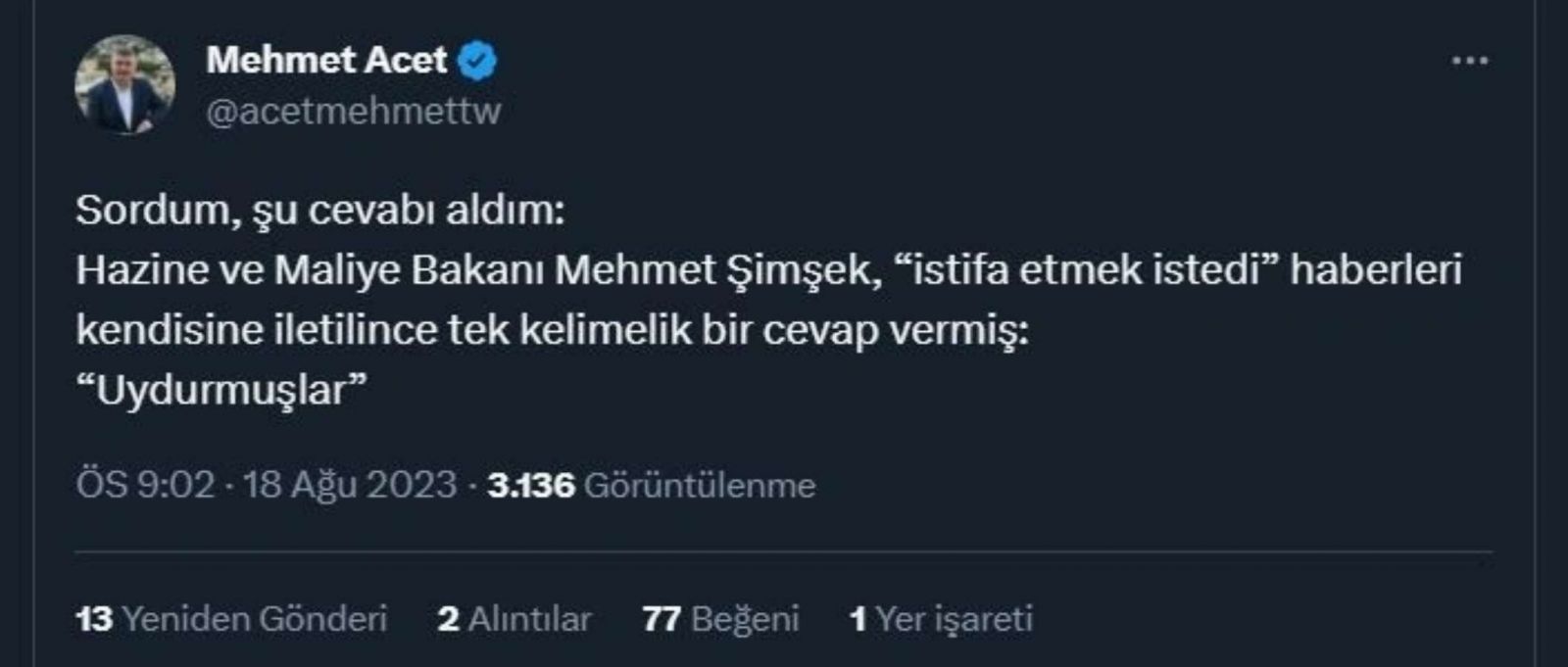 Son olarak Haber7 Yazarı Mehmet Acet, Hazine ve Maliye Bakanı Mehmet Şimşek’in istifa iddialarına ilişkin ilk tepkisini sosyal medya hesabından paylaştı.