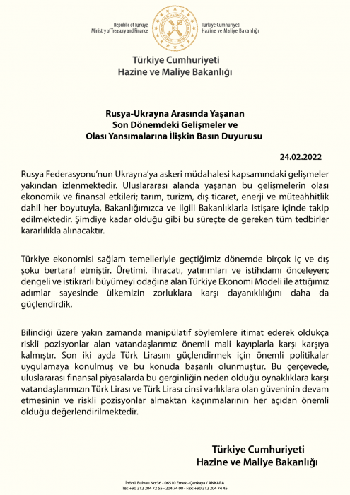 Bakanlığın sosyal medya hesabından yayımlanan "Rusya-Ukrayna arasında yaşanan son dönemdeki gelişmeler ve olası yansımalarına ilişkin basın duyurusu" başlıklı açıklamada söz konusu gelişmelerin yakında izlendiği belirtildi.