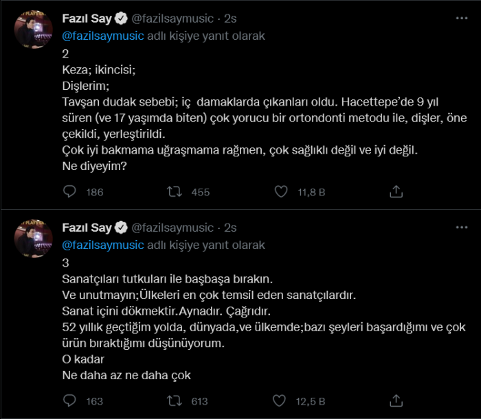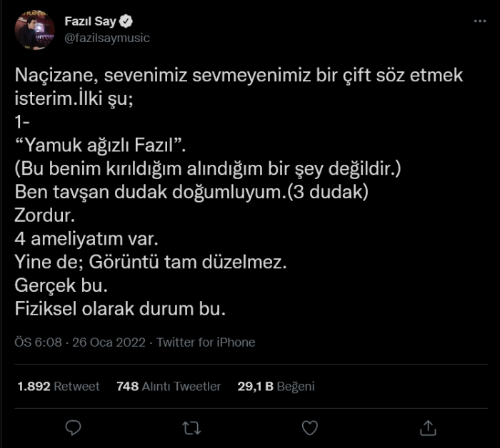 Fazıl Say, kendisine dış görünüşü üzerinden yapılan saldırgan yorumlara Twitter hesabından 5 maddede yanıt verdi.