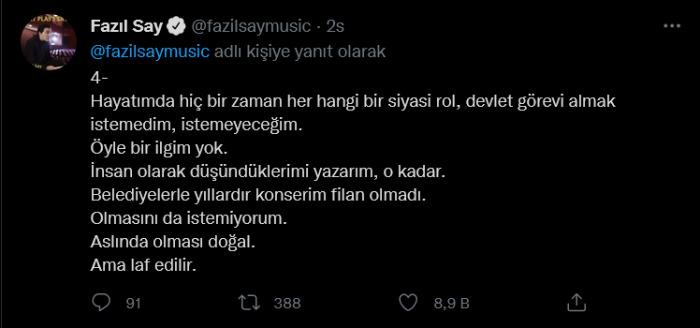 Fazıl Say ise tartışmalara esprili bir paylaşımla dahil olmuş ve İmamoğlu çifti ile çekildiği bir fotoğrafı paylaşarak, “Fotoğrafı çeken de Devlet Bahçeli’dir! Salvador Dali’nin selamları var” notunu düşmüştü.
