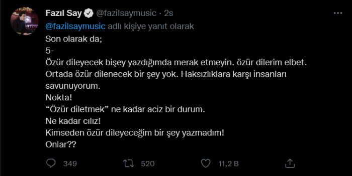 Son olarak da; 5- Özür dileyecek bir şey yazdığımda merak etmeyin. Özür dilerim elbet. Ortada özür dilenecek bir şey yok. Haksızlıklara karşı insanları savunuyorum. Nokta! ‘Özür diletmek’ ne kadar aciz bir durum. Ne kadar cılız! Kimseden özür dileyeceğim bir şey yazmadım! Onlar??”