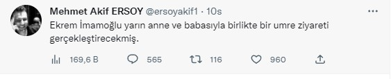 İstanbul Büyükşehir Belediye (İBB) Başkanı Ekrem İmamoğlu, anne ve babasıyla birlikte bugün umreye gidecek.