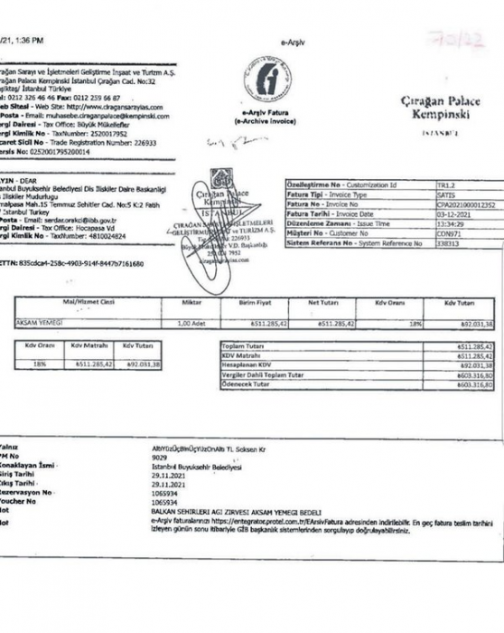 İBB'nin kendine ait onca lüks tesisi varken, İBB Dış İlişkiler Daire Başkanlığı Dış İlişkiler Müdürlüğü'nün, 29 Kasım 2021'de Çırağan Palace Kempinski Otel'de yenilen yemeğe 603 bin 316 TL ödediği belirlendi.