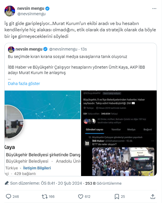 Mengü, sonrasında bu paylaşımı alıntılayarak, Murat Kurum’un ekibinin kendisini aradığını ve bu hesabın kendileriyle alakası olmadığını söylediklerini aktardı.
