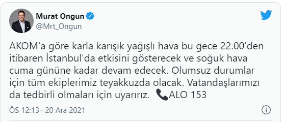 "AKOM'a göre karla karışık yağışlı hava bu gece 22.00'den itibaren İstanbul'da etkisini gösterecek ve soğuk hava cuma gününe kadar devam edecek. Olumsuz durumlar için tüm ekiplerimiz teyakkuzda olacak. Vatandaşlarımızı da tedbirli olmaları için uyarırız."