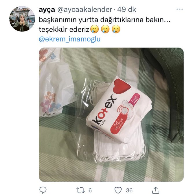 İBB Haber Twitter hesabının da alıntıladığı bir tweet’te ‘başkanımın yurtta dağıttıklarına bakın… teşekkür ederiz‘ notuyla bir paket ped fotoğrafı paylaşıldı.