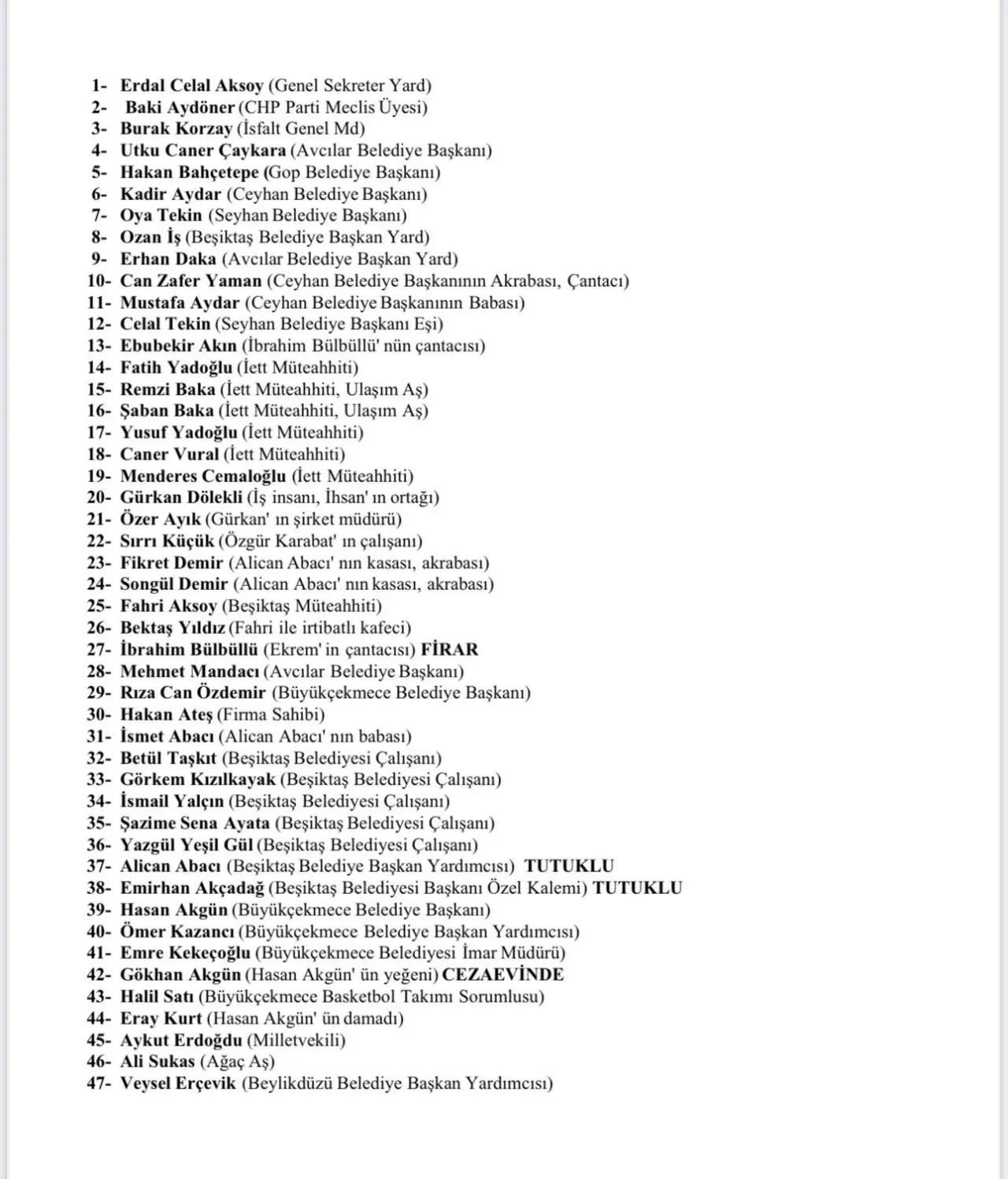 İstanbul Cumhuriyet Başsavcılığı tarafından İBB ve bazı ilçe belediyelerine yönelik yürütülen yolsuzluk soruşturmasında 5. dalga operasyon başlatıldı. Aralarında belediye başkanları, İBB yöneticileri ve CHP'li siyasetçilerin de bulunduğu 47 kişi hakkında gözaltı kararı verildi. Soruşturmada, suç örgütü lideri Aziz İhsan Aktaş’ın ifadeleri belirleyici oldu.