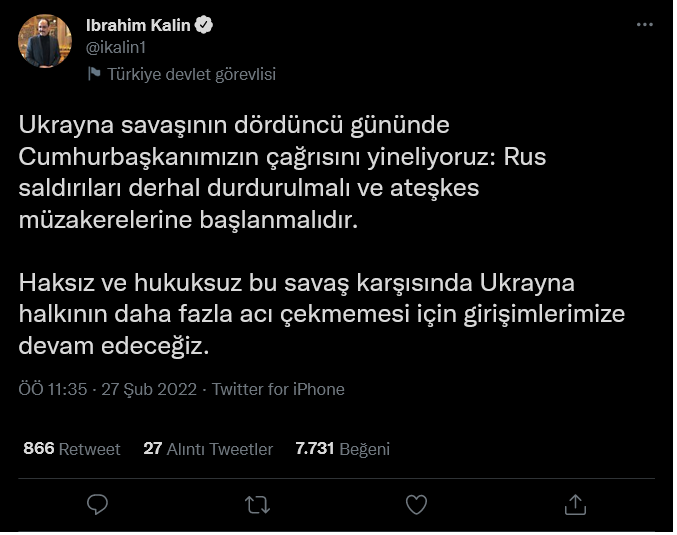 Cumhurbaşkanlığı Sözcüsü İbrahim Kalın, Rusya'nın Ukrayna işgali için sosyal medya hesabından paylaşım yaptı.