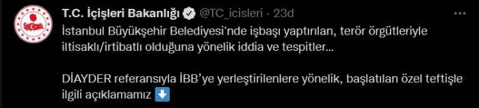 İçişleri Bakanlığı, Twitter hesabından İstanbul Büyükşehir Belediyesi'nde (İBB) toplam 557 personelin terör örgütü iltisaklı/irtibatlı olduğu yönündeki iddialar sebebiyle özel teftiş başlattı.