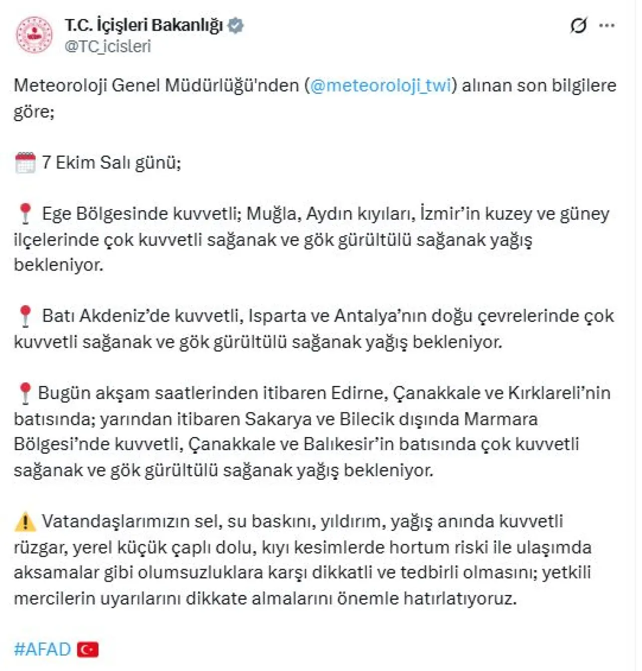 Bakanlığın sosyal medya hesabından yapılan açıklamada, "Meteoroloji Genel Müdürlüğü'nden alınan son bilgilere göre; 7 Ekim Salı günü Ege Bölgesi'nde kuvvetli; Muğla, Aydın kıyıları, İzmir'in kuzey ve güney ilçelerinde çok kuvvetli sağanak ve gök gürültülü sağanak yağış bekleniyor. Batı Akdeniz'de kuvvetli, Isparta ve Antalya'nın doğu çevrelerinde çok kuvvetli sağanak ve gök gürültülü sağanak yağış bekleniyor.