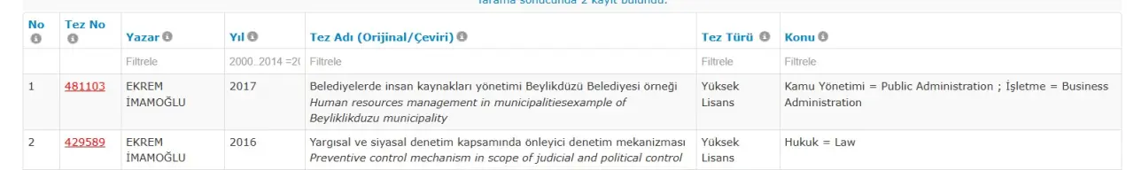 Ancak, İmamoğlu’nun 2016 tarihli “Yargısal ve siyasal denetim kapsamında önleyici denetim mekanizması” ve 2017 tarihli “Belediyelerde insan kaynakları yönetimi: Beylikdüzü Belediyesi örneği” başlıklı tezleri halen YÖK’ün resmi Ulusal Tez Merkezi veri tabanında erişilebilir durumda.