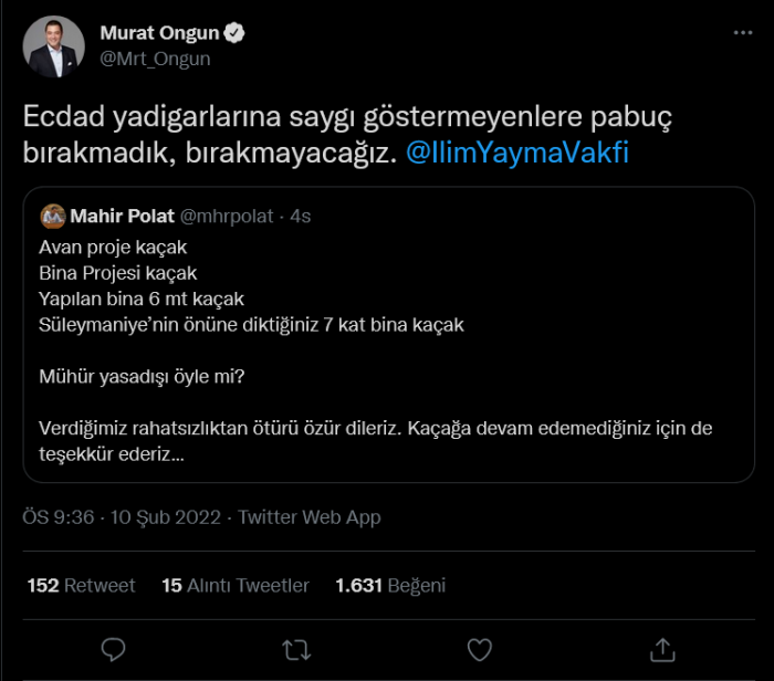 "Avan proje kaçak. Bina Projesi kaçak. Yapılan bina 6 metre kaçak. Süleymaniye’nin önüne diktiğiniz 7 kat bina kaçak Mühür yasadışı öyle mi? Verdiğimiz rahatsızlıktan ötürü özür dileriz. Kaçağa devam edemediğiniz için de teşekkür ederiz…"