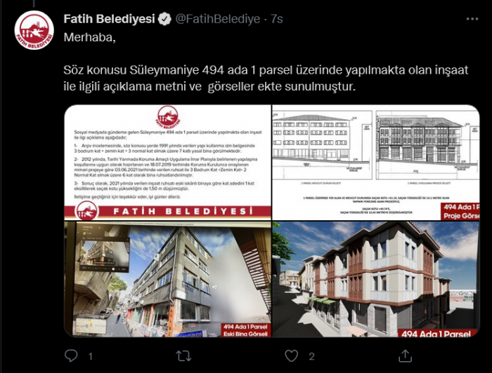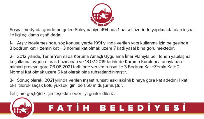 Belediye, mimari projenin 2012'de Tarihi Yarımada Koruma Amaçlı Uygulama İmar Planıyla belirlenen yapılaşma koşullarına uygun olarak hazırlandığı, 18 Temmuz 2019'da Koruma Kurulunca onaylandığı; 3 Haziran 2021'de verilen ruhsatla 3 bodrum kat, zemin kat ve 2 normal kat olmak üzere 6 kat olarak binanın ruhsatlandırıldığı vurguladı.