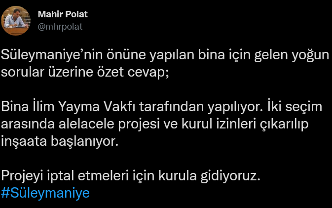 Süleymaniye’nin önüne yapılan bina için gelen yoğun sorular üzerine özet cevap;