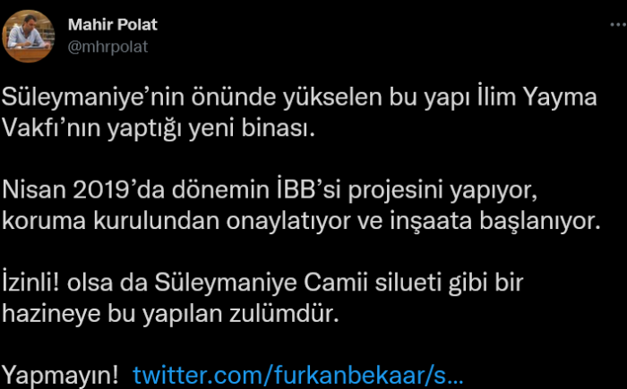 Süleymaniye’nin önünde yükselen bu yapı İlim Yayma Vakfı’nın yaptığı yeni binası.Nisan 2019’da dönemin İBB’si projesini yapıyor, koruma kurulundan onaylatıyor ve inşaata başlanıyor.