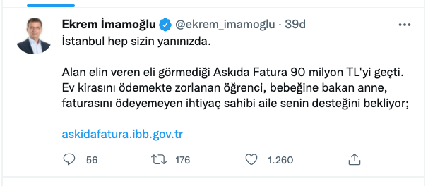 İmamoğlu Twitter hesabından yaptığı paylaşımda, "İstanbul hep sizin yanınızda. Alan elin veren eli görmediği Askıda Fatura 90 milyon TL'yi geçti. Ev kirasını ödemekte zorlanan öğrenci, bebeğine bakan anne, faturasını ödeyemeyen ihtiyaç sahibi aile senin desteğini bekliyor; https://askidafatura.ibb.gov.tr" ifadesini kullandı.