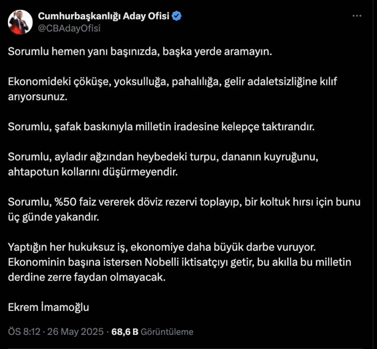 İmamoğlu, ekonomideki çöküş, yoksulluk, pahalılık ve gelir adaletsizliği gibi sorunlara kılıf arandığını belirterek, “Sorumlu, şafak baskınıyla milletin iradesine kelepçe taktırandır” dedi. Ayrıca, “%50 faiz vererek döviz rezervi toplayıp, bir koltuk hırsı için bunu üç günde yakan da sorumludur” vurgusunu yaptı.