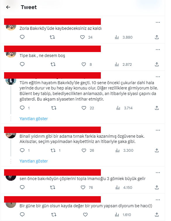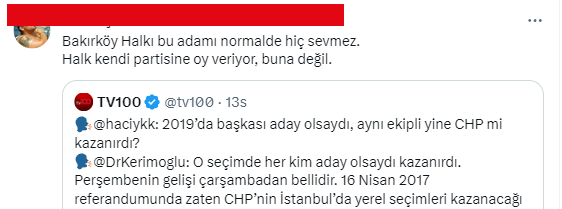 Ancak sosyal medyada programa dair yorumda bulunan vatandaşlar Kerimoğlu ile hiç de aynı fikirde değiller. Bakırköy’deki sıkıntıların tek sorumlusu olarak Bakırköy Belediye Başkanı Bülent Kerimoğlu’nu gören birçok kişi Kerimoğlu’nun İBB adayı olması ya da yeniden Bakırköy Belediye Başkanı adayı olması durumunda kendisine oy vermeyeceklerini belirtiyor.