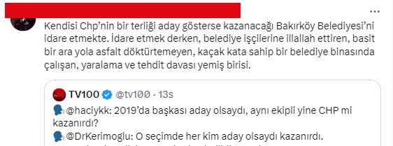 Muhalif. GÜNDEM İmamoğlu’nun, “Bakırköy’de sokağa çıkacak yüzü olmayanlara neden söz veriyorsunuz?” sözlerine cevap vermek isteyen Kerimoğlu, sosyal medyada büyük tepki gördü