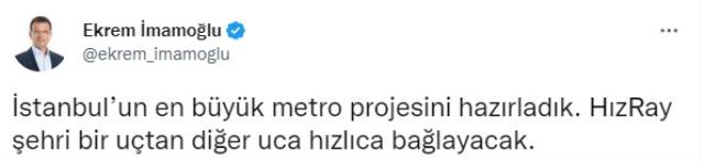 İBB Başkanı, söz konusu videoyu "İstanbul'un en büyük metro projesini hazırladık. HızRay şehri bir uçtan diğer uca hızlıca bağlayacak." ifadeleri ile paylaştı.