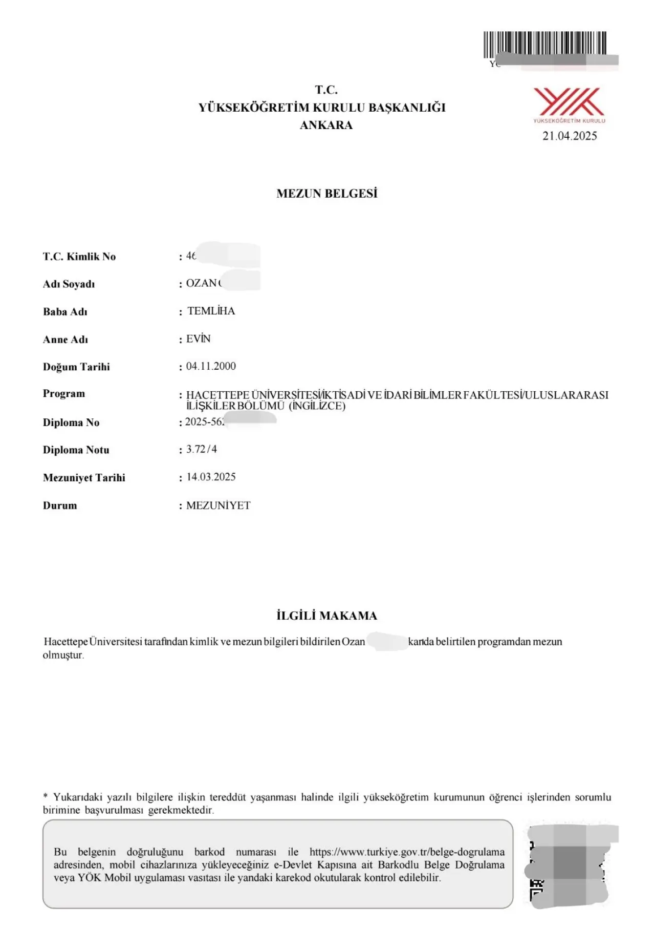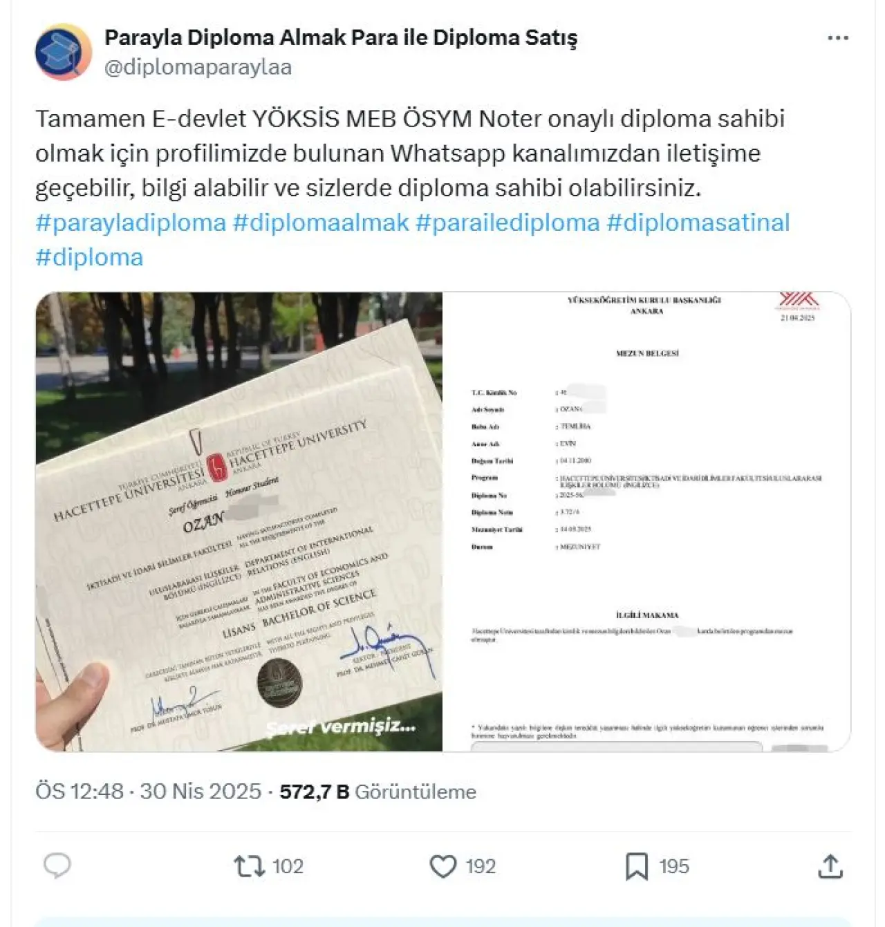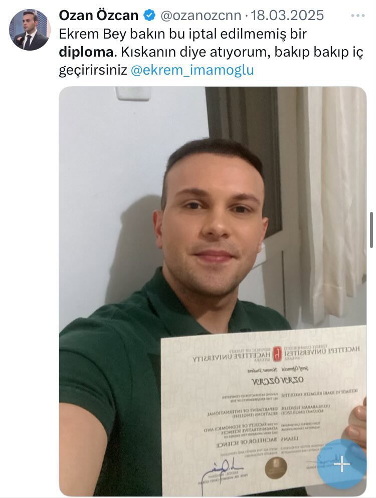 Son günlerde sahte diploma konusu gün yüzüne çıkarken, X platformunda yer alan ‘Parayla Diploma Almak Para ile Diploma Satış’ isimli bir hesaptan Özcan'ın diplomasına oldukça benzer bir diplomanın paylaşımı yapıldı.