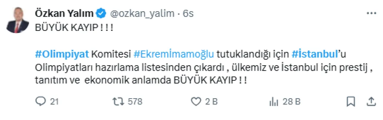 Paylaşımda, “BÜYÜK KAYIP ! ! ! #Olimpiyat Komitesi #Ekremİmamoğlu tutuklandığı için #İstanbul’u Olimpiyatları hazırlama listesinden çıkardı. Ülkemiz ve İstanbul için prestij, tanıtım ve ekonomik anlamda BÜYÜK KAYIP ! !” ifadelerine yer verildi.