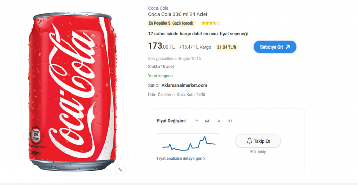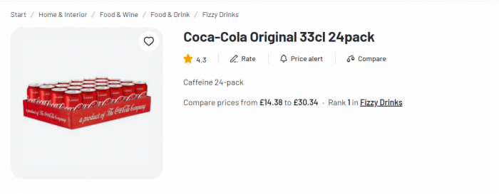 Diğer çok tükettiğimiz bir ürünü kıyaslayalım. 330ml'lik 24'lü Kola paketi 14.38 pound fiyatında.