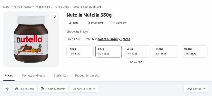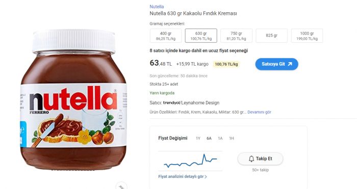 Bir de şekerli bir ürün, kahvaltı ürününü kıyaslayalım. 630gr'lık bir Nutella 3.99 pound değerinde.