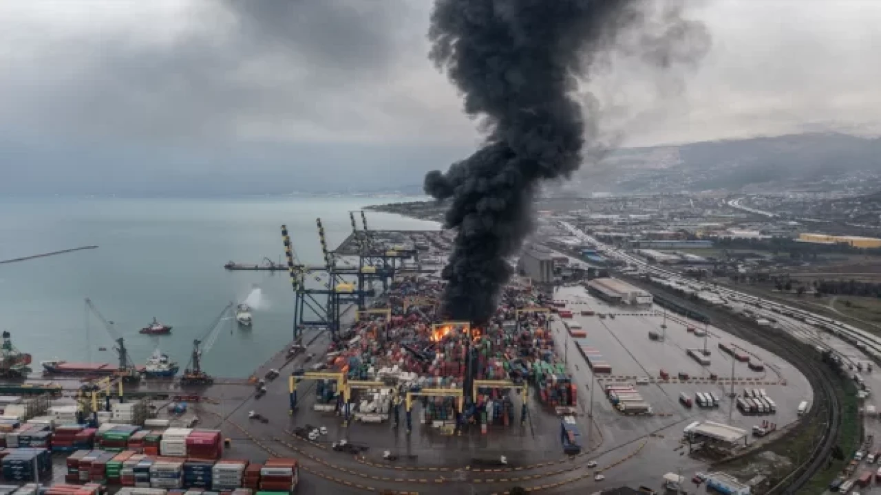 HATAY (AA) İskenderun Limanında depremin ardından devrilen konteynerlerde yangın çıktı.